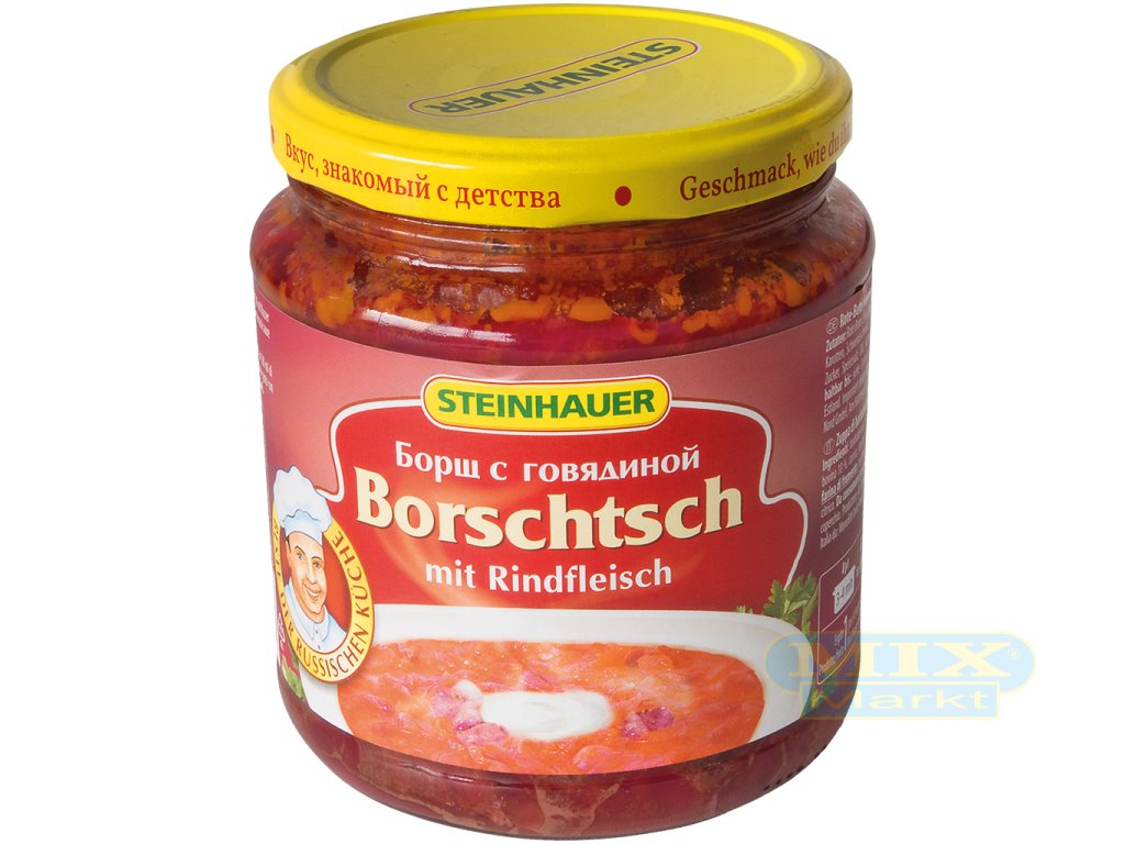Hovězí boršč: Chcete ochutnat tradiční ruská jídla? Hovězí boršč je polévka z červené řepy s jedinečnou chutí. Nechte se tímto chuťovým zážitkem okouzlit a udělejte si zásobu, kterou budete mít po ruce. Ideální pro rychlé občerstvení nebo když chcete hostům nabídnout něco lahodného. Produkt STEINHAUER.